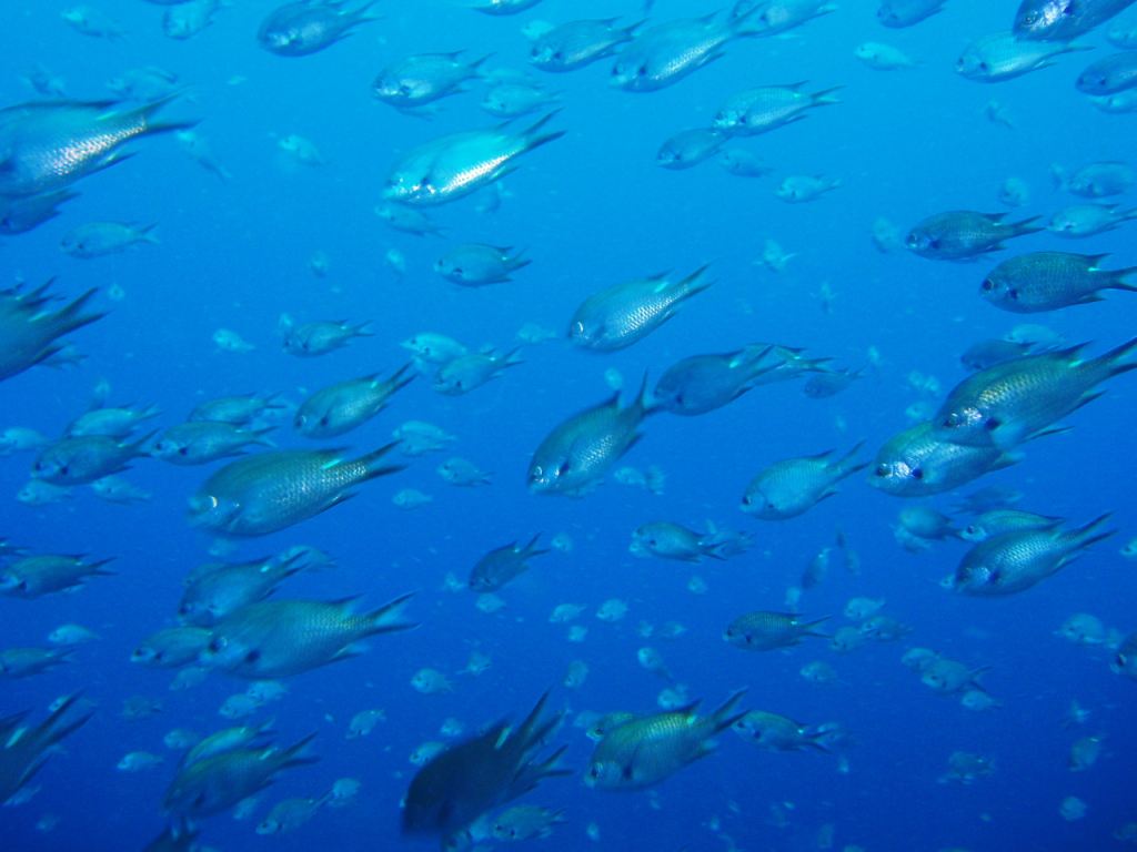 冠島に到着すると海は貸し切り状態っ!そんな中、まず1本目は「ナガシタグリ」から ダイビングがスタートしました! 水面付近には赤潮がところどころにありましたが、水深が深くなると透明度も良く、 スコーンと20mオーバー! 水底からドンと突き出た地形が迫力バツグンで、その大きな根の周りにはスズメダイ やイサキがグッチャリと群れ、ウットリするほど見応えがありました!