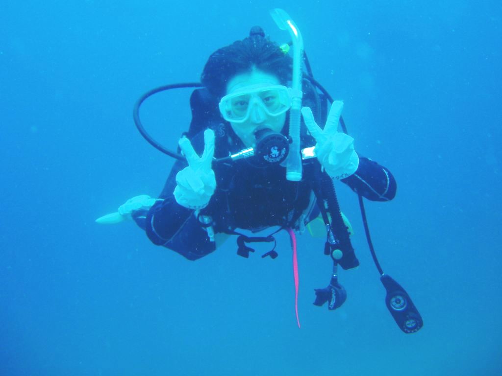 久しぶりのダイビングなので、まず1本目はビーチからエントリー! 浅いところで簡単なスキルチェックをすると、じぇーんじぇん問題ナッシング! 耳抜きもクリアし、ウエイト2キロで中性浮力もバッチリでしたぁー! お楽しみの海中散歩では、ソラスズメダイの群れ、ボラ、ツノダシ、ハタタテダイ、 タカノハダイ、クサフグ、コウイカ、クロホシイシモチ、アジなどといった色んなお 魚たちをジックリ観賞し、エアの消費も少なく、55分間のんびりとリフレッシュダ イビングができましたね!