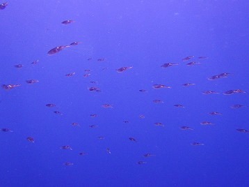 潮が止まったせいか、透明度は1本目に比べ落ちるものの、ここは水深−5mから− 35mのドロップオフポイントで、地形が豪快で迫力バツグン! 無数のスズメダイ、イサキの群れがダイバーたちを囲むシーンは圧巻で、非日常的な 世界がたっぷり広がっていましたネ!