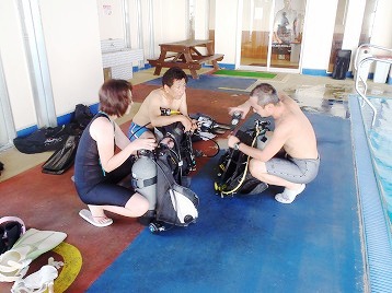 そんな中、まずはダイビング専用プールでダイビングに欠かせないスキルの練習から スタート! 2回ほど海外で体験ダイビングの経験があるお2人は水中に慣れてる感があり、不安 な様子を見せることなく順調にスキルをこなしておりましたよぉー!(^^)v