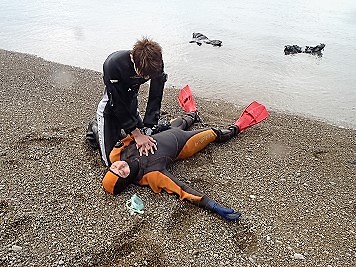 海洋実習初日は、シーズン前の平日ということで白崎海洋公園のプールはほぼ貸し切 り状態の中、広々としてとても使いやすいコンディション!超ラッキー♪ デモンストレーション役に入江インストラクターにもお手伝いいただき、セルフレス キューや負傷したダイバーの救助方法、水面アシストの方法、ダイバーの搬送方法、 エキジット方法、応急処置といった様々なテクニックを習得。 初めてのことばかりでぎこちないスタートでしたが、何回か練習しているうちに自然 に体が覚えるようになり、一歩レスキューダイバーに近づいてきた様子でしたネ!