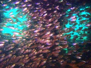 ランチ休憩後、午後からは関西屈指のレックポイント「沈船」にエントリーすると、水深18mの砂地に全長28mの巨大な船(タグボート)が沈んでおり、まるでタイタニックの世界を疑似体験できたり、船内は魚たちの住み家にもなっており、キンメモドキやクロホシイシモチがグッチャリと群れ、とても魚影が濃いのが印象的! ゲストの方たちもこんなにたくさんの魚の群れを見たのは初めてだったようで、カメラに夢中になりながら、気付けば1時間近いロングダイブとなりました!(*^-^*)