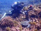 高確率でウミガメに会えるランデブーポイントまで足を伸ばすと、探すこと10分…お散歩中の子ガメに遭遇し、逃げることなく10分間ほど一緒に遊んでくれたり、シコロサンゴの群生がとてもキレイで癒されましたよぉ〜♪