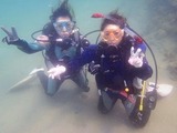 ランチ休憩後、午後からは「体験ダイビングコース」にチャレンジしました! 器材を背負った瞬間“うっ…重たーい!”と悲鳴が聞こえましたが“それは重力のいたずら…。水中に入ったら無重力になるからもう少しだけ我慢してねぇ〜!”なーんて言いながらエントリー!(^^ゞ