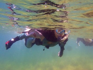 3点セット(マスク・スノーケル・フィン)を装着して、海面をプカプカ浮かびながら、沖の方へ泳いでいくと…!“あっ!青い魚っ!”“あっ!フグがいる!”群れを見つけると“メッチャ魚おるっ!”などを連呼。約1時間ほど水中の様子を観察し、楽しんでいただきました♪(*^-^*)