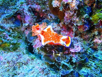 そして、2本目は「色津」にエントリーすると、こちらは魚の数は少ないものの、一転して地形ダイブ&ウミウシパラダイスでした! 不思議な形をしたトンネルやアーチ、砂地の水路など地形がとてもユニークで、目を凝らしながら生物探しをすると、アオウミウシ、キイロウミウシ、ヒョウモンウミウシ、キイロイボウミウシ、イガグリウミウシ、サラサウミウシ、ニシキウミウシ、ミカドウミウシ(30p)など、色とりどりのウミウシたちがたくさん登場し、ダイバーの目を楽しませてくれました!