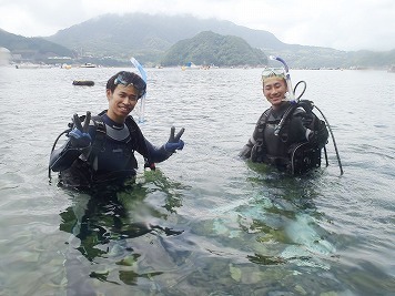 コース初日は霧雨のような細い雨が降ったり止んだりでしたが、海はベタ凪で水温は24〜25℃と温かくまずまずのコンディション! そんな中、お2人にはこれから海の中を安全に快適に潜れるようになるための基本ルールやテクニックを楽しく学んでいただきました!