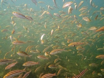 フィッシュウォッチング中には、ここ最近、水温が温かくなったせいか、魚の数がグーンと増え、特にイサキの稚魚がハンパない群れで泳ぎ回り、アジやメバル、カワハギなど美味しそうな魚たちも間近で見ることができましたよぉー!