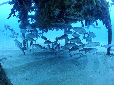 水深18mの砂地に鎮座する全長約30m!高さ7〜8mの巨大な沈没船は、透明度が澄んでいたせいか、いつもより大きく見えて圧巻の姿っ! 今春に産まれたばかりの稚魚たちがたくさん群れ、夏から秋にかけて沈船名物の大きな群れを作るんでしょうね!